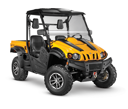 A quick glance at the Challenger 500 utility vehicles reveals its basic and essential features for UTV buyers. The equipment leaps ahead of the pack with a pre-installed roof that provides protection from the elements, whether the element is bright summer sunshine or the occasional heavy rain showers. The vehicle also features 26-inch wheels that are large enough to handle rough terrain and stable enough to provide added safety on uneven ground. The large tires don’t detract from this vehicle’s relatively low center of gravity, which serves as a further enhancement of its safety credentials. A large windshield is installed to prevent injury from debris or inclement weather. Uniquely, this windshield can be removed after purchase if buyers prefer to operate their UTV without this protection.