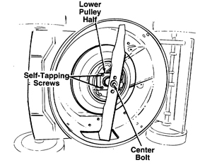 With the baffle and belt covers removed you now have access to the blade adapter and drive pulley. You will need to remove the belt that connects them and then take the blade adapter off of the crankshaft.